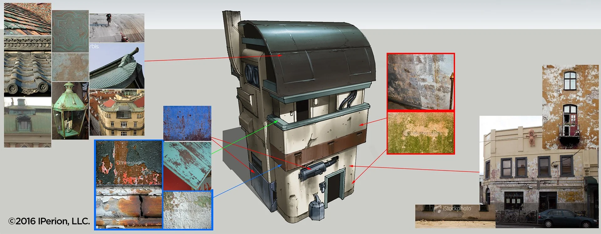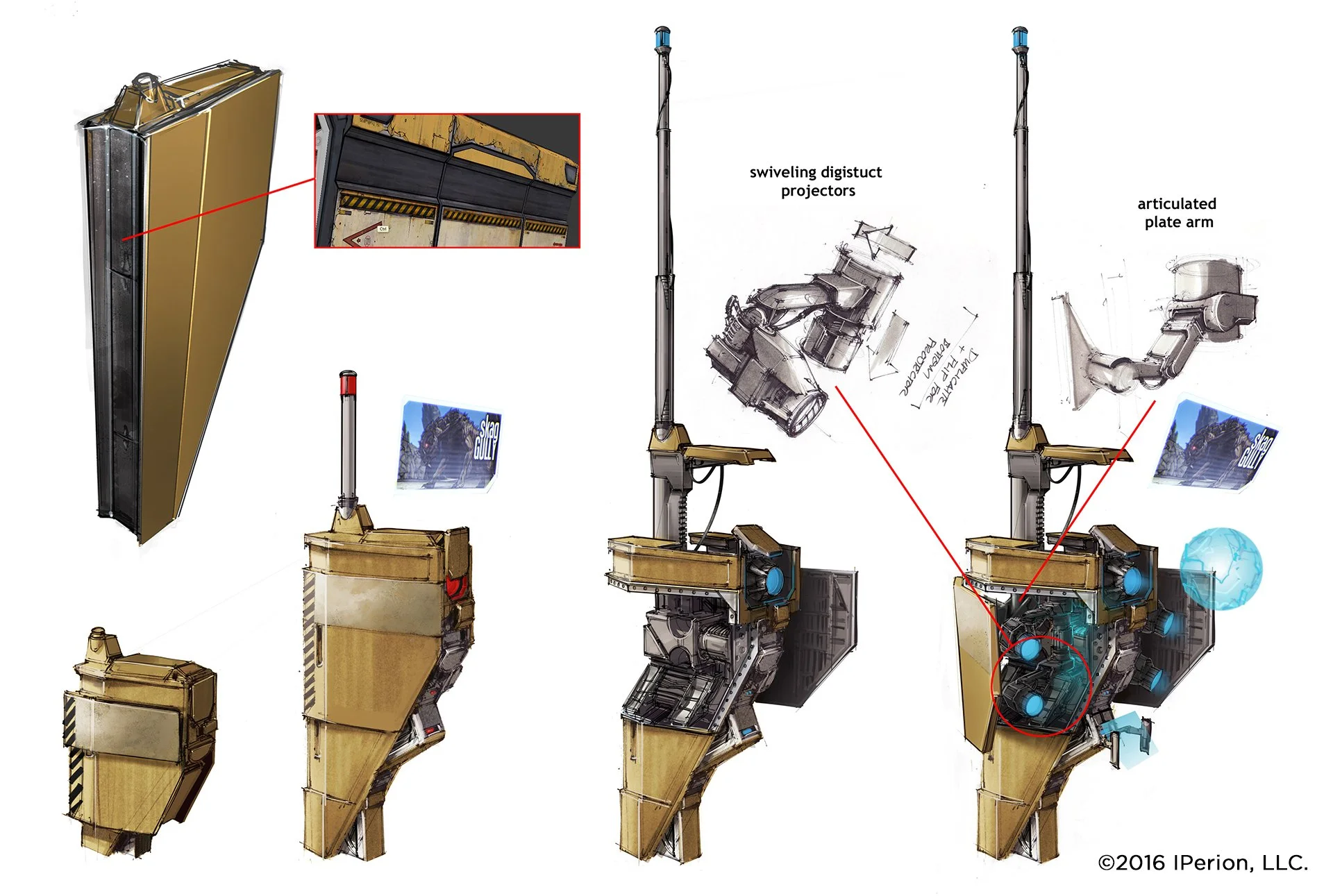 I developed the scenario that one of the game’s manufacturers developed a line of automated factory ships that are launched all over the galaxy to mine raw ore to create their weapons. This one was abandoned for whatever reason and over time was consumed by the landscape until only its enigmatic conning tower was left sticking out of the ground. Over decades travelers slowly built up the town, unbeknownst to them what lie beneath them. The scenario informed the design language of the town and ultimately became canon for the game.