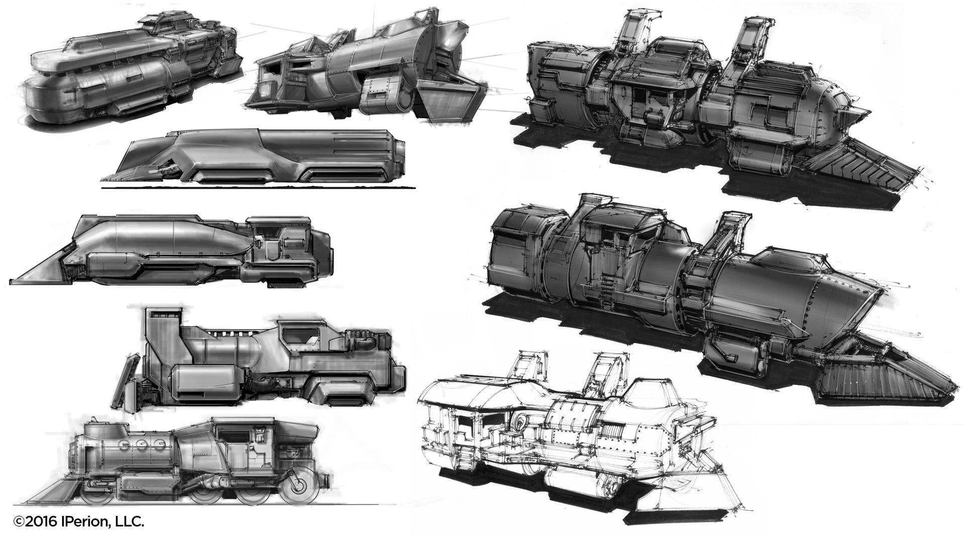 The Train: I am a huge fan of Doc Brown’s flying locomotive from the end of the film Back to the Future III, so that notion stuck around for a bit. The art director and I ended up settling on something more contemporary instead of being too on-the-nose Western, so we leaned more on a bulky, Eastern-bloc diesel locomotive. To push it further away from the real-world, we made the train levitate and ride a monorail which would provide a cool visual with dynamic, articulated arms. This would permit the level designers to have fun placing the tracks on any surface.
